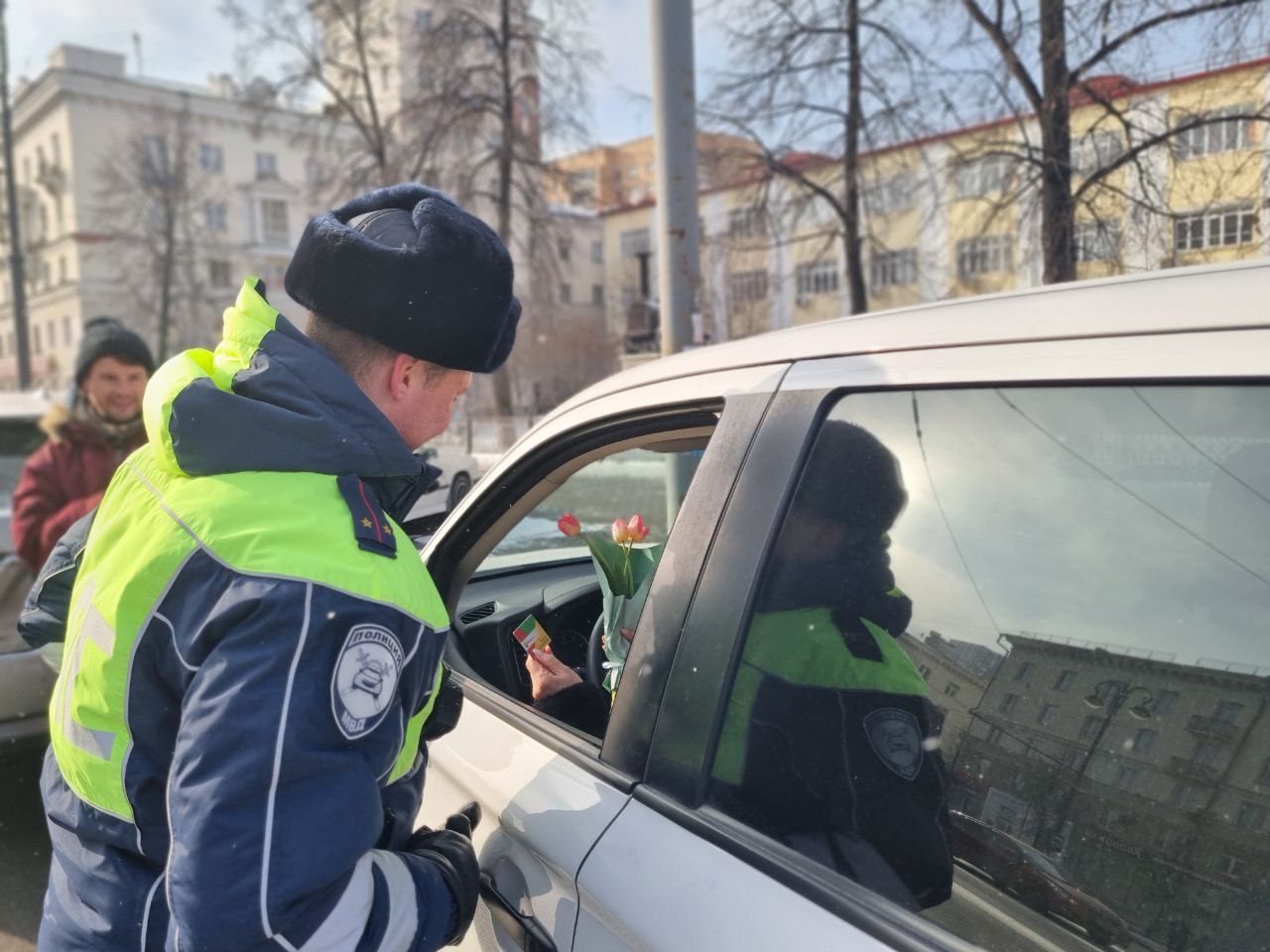 Пятница, 7 марта, 13.01 Экипажи ДПС поздравляют водительниц в преддверии 8 Марта в Свердловской области