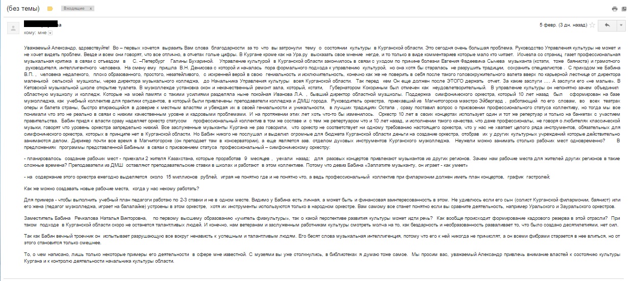Я не знаток процессов управления культурой Курганской области, многие изложенные факты и оценки, данные в письме, на мой взгляд, в большей степени должны быть понятны работникам этой сферы именно Курганской области. Но на что не мог не обратить внимание: