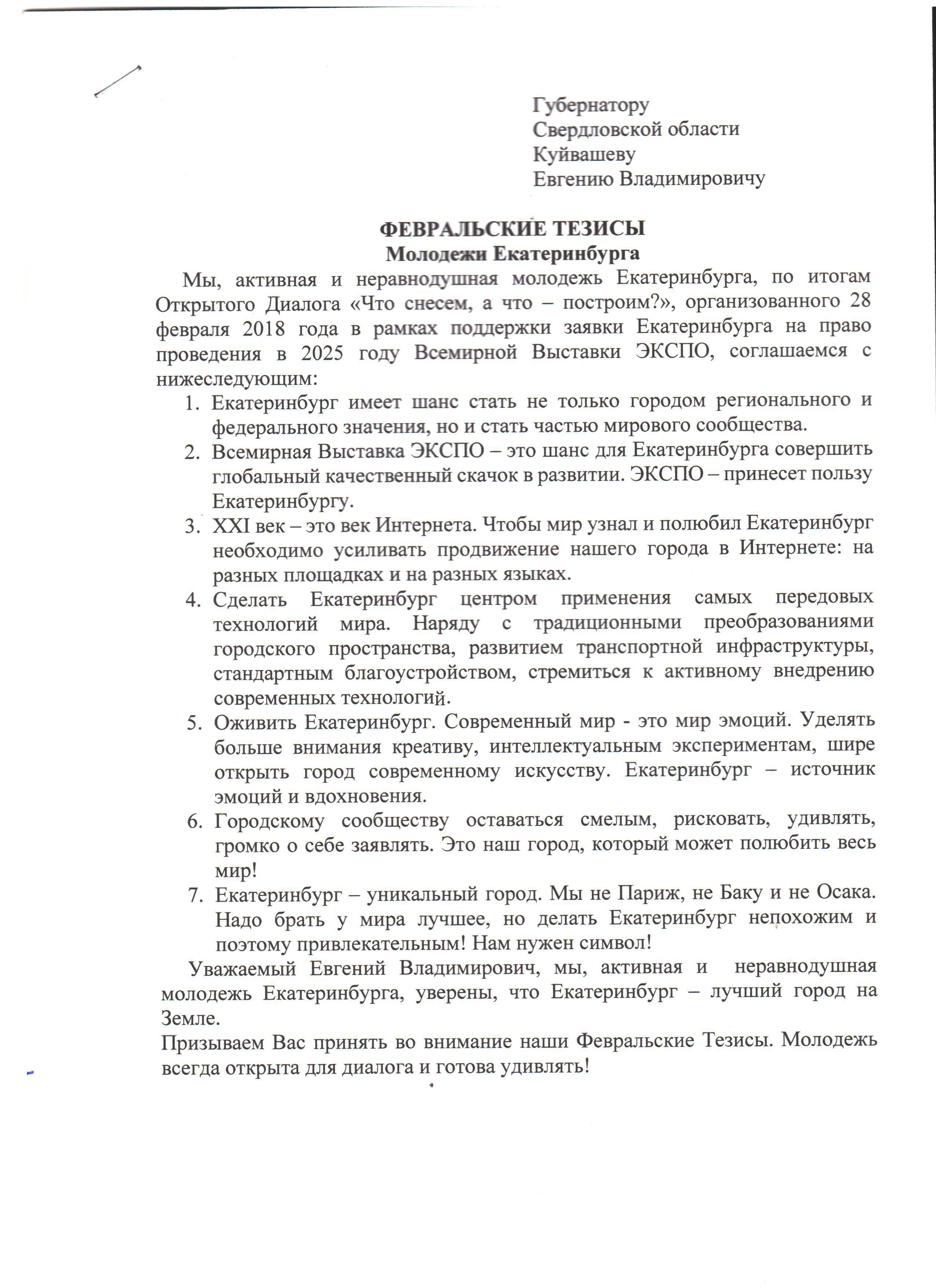 Екатеринбургские студенты передали губернатору «февральские тезисы»