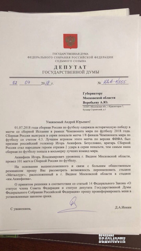 Депутат Государственной думы Дмитрий Ионин после исторической победы нашей сборной в 1/8 чемпионата мира по футболу над Испанией выступил с предложением переименовать в честь вратаря Игоря Акинфеева, который отразил пенальти и, по сути, подарил победу России, футбольный стадион «Металлург» в городе Видное Московской области. Известно, что Акинфеев, капитан сборной РФ, — самый известный уроженец этого города. Дмитрий Ионин уже направил запрос на имя губернатора Московской области Андрея Воробьева.