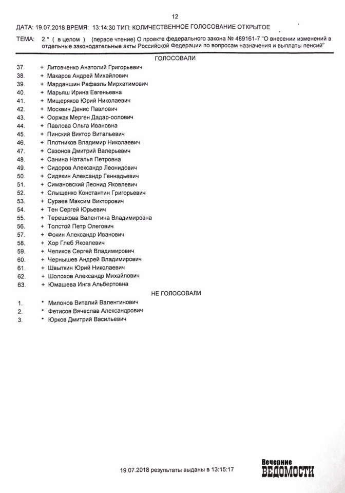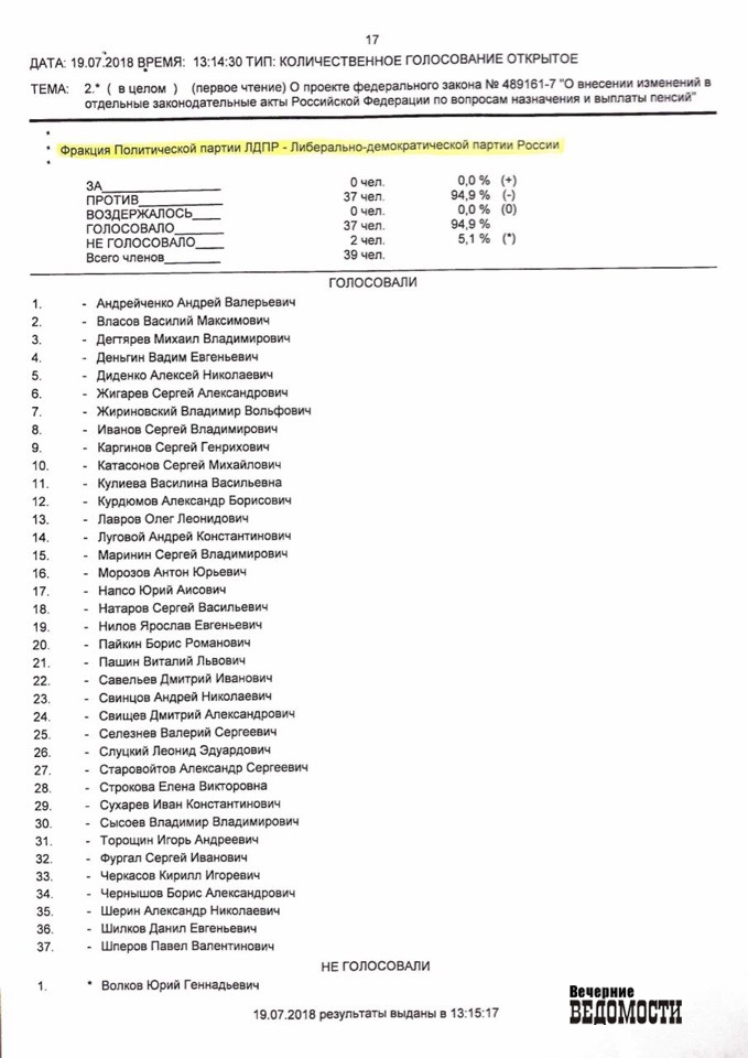 Все члены фракции ЛДПР, присутствовавшие на заседании, — 37 депутатов — проголосовали «против» антинародного закона. Среди них — свердловчане Игорь Торощин и Данил Шилков. Еще двое «жириновцев» не приняли участие в голосовании.