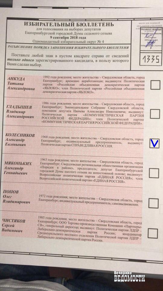 Стали известны предварительные результаты голосования в Екатеринбургскую городскую думу по одномандатному округу № 4 (Железнодорожный район). По данным veved.ru, в настоящий момент с опережением в 400 голосов от ближайшего преследователя вырвался вперед управляющий «РЭМП Железнодорожного района» Александр Колесников, выдвинутый «Справедливой Россией». Следом идет депутат городской думы прошлого созыва Александр Мяконьких, поддержанный «Таганским Рядом» и мэрией Екатеринбурга. Окончательные результаты станут известны утром 10 сентября, однако тенденция показательна.