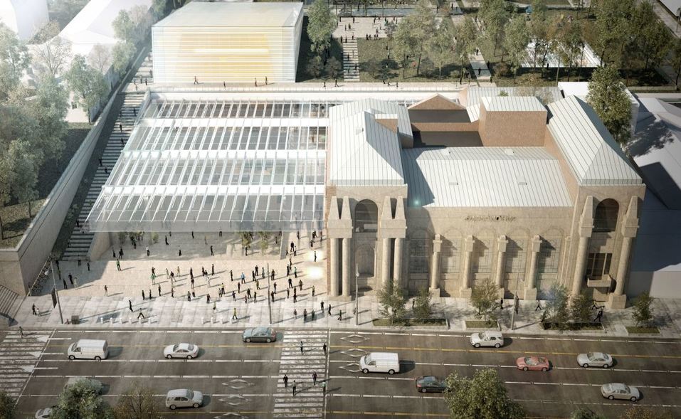 Так, по задумке, должен выглядеть новый акустический комплекс. Видим: расположенная на дальнем плане филармония сливается с новым зданием