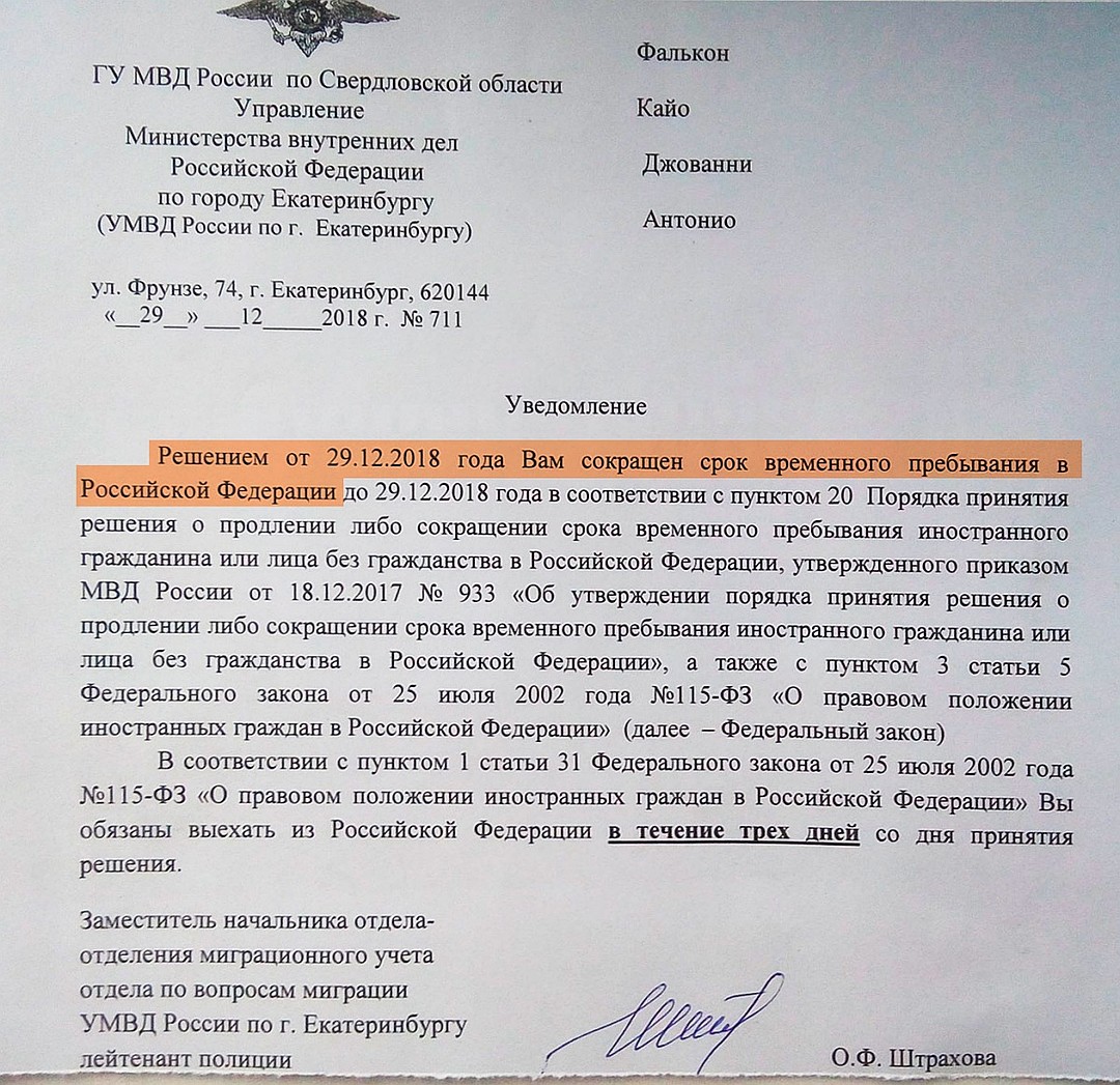 В письме, отправителем которого было ГУ МВД по Свердловской области, значилось: территорию России Джованни должен покинуть до 1 января. Это стало настоящим ударом для 36-летнего уроженца Латинской Америки, ведь и Урал покидать не хочется, и денег на билет домой не хватает.