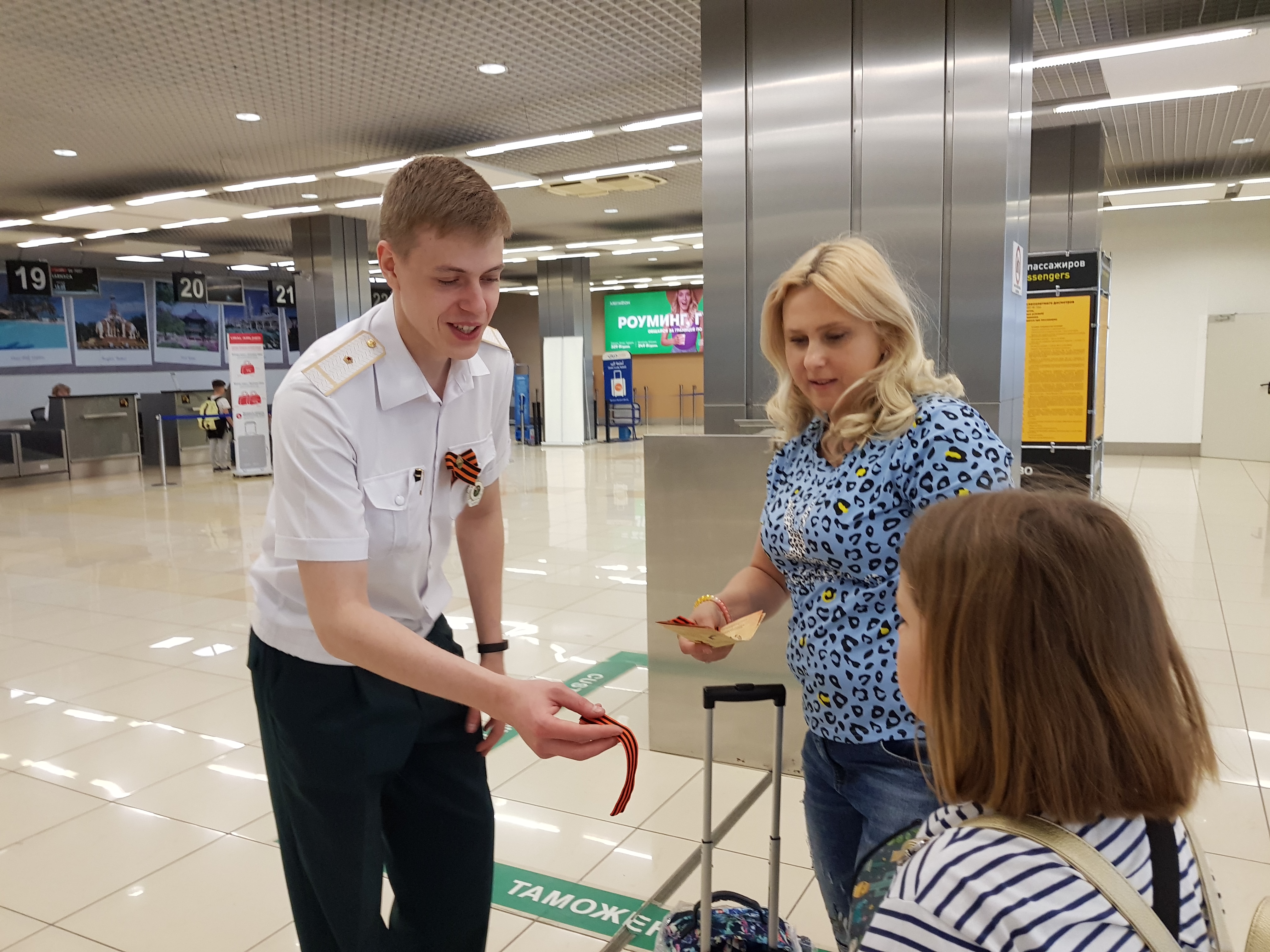 В екатеринбургском международном аэропорту Кольцово пассажирам международных рейсов выдают Георгиевские ленты и памятки об истории появления символа Победы.