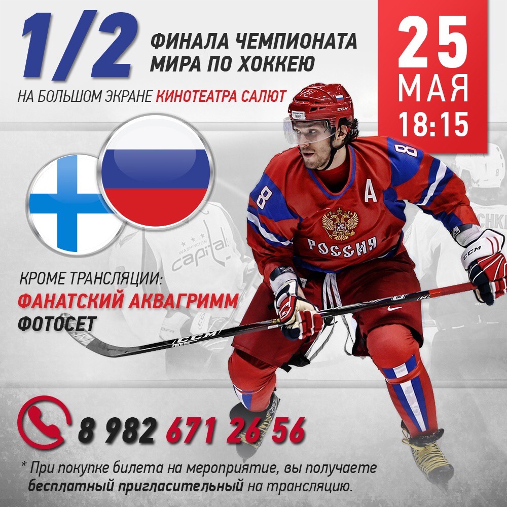Сегодня, 25 мая, в Екатеринбурге в кинотеатре «Салют» состоится трансляция полуфинала чемпионата мира по хоккею, где сборная России сразится со сборной Финляндии. Начало в 18:15.