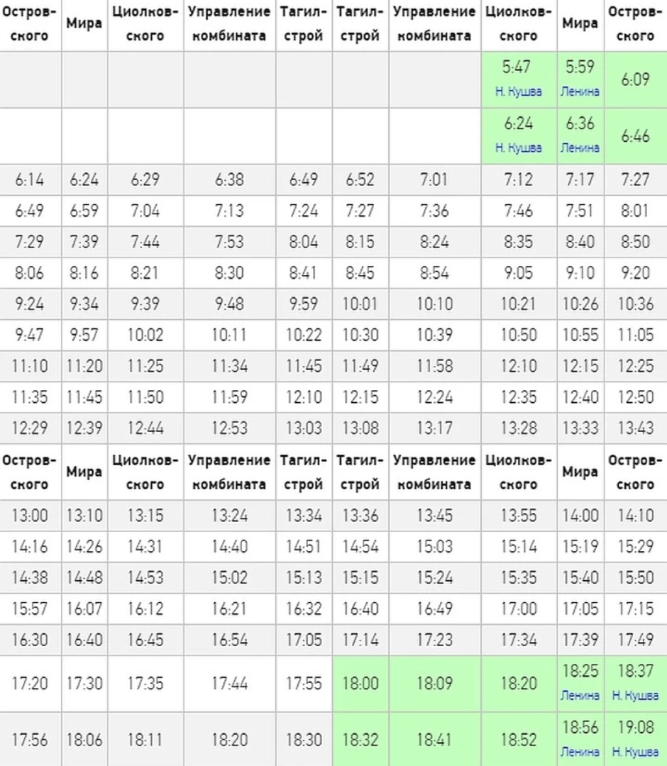 Как сообщается на сайте МУП «Тагильский трамвай», начало движения маршрута в будние дни назначено на 06:14, а в выходные –на 06:12. Последний рейс отправляется на 18:30.