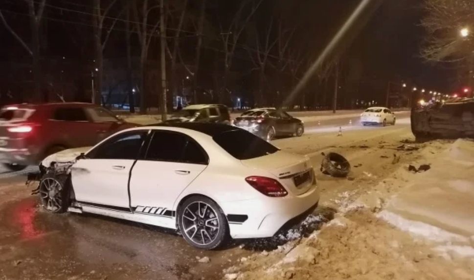 Очевидец происшествия рассказал, что столкновение было сильное — Mercedes остался без «морды», а в KIA, которая перевернулась, зажало человека.