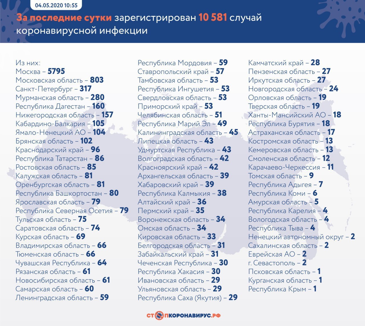 Наибольшее число заболевших в Москве — 5795, Подмосковье — 803 и Петербурге — 317.