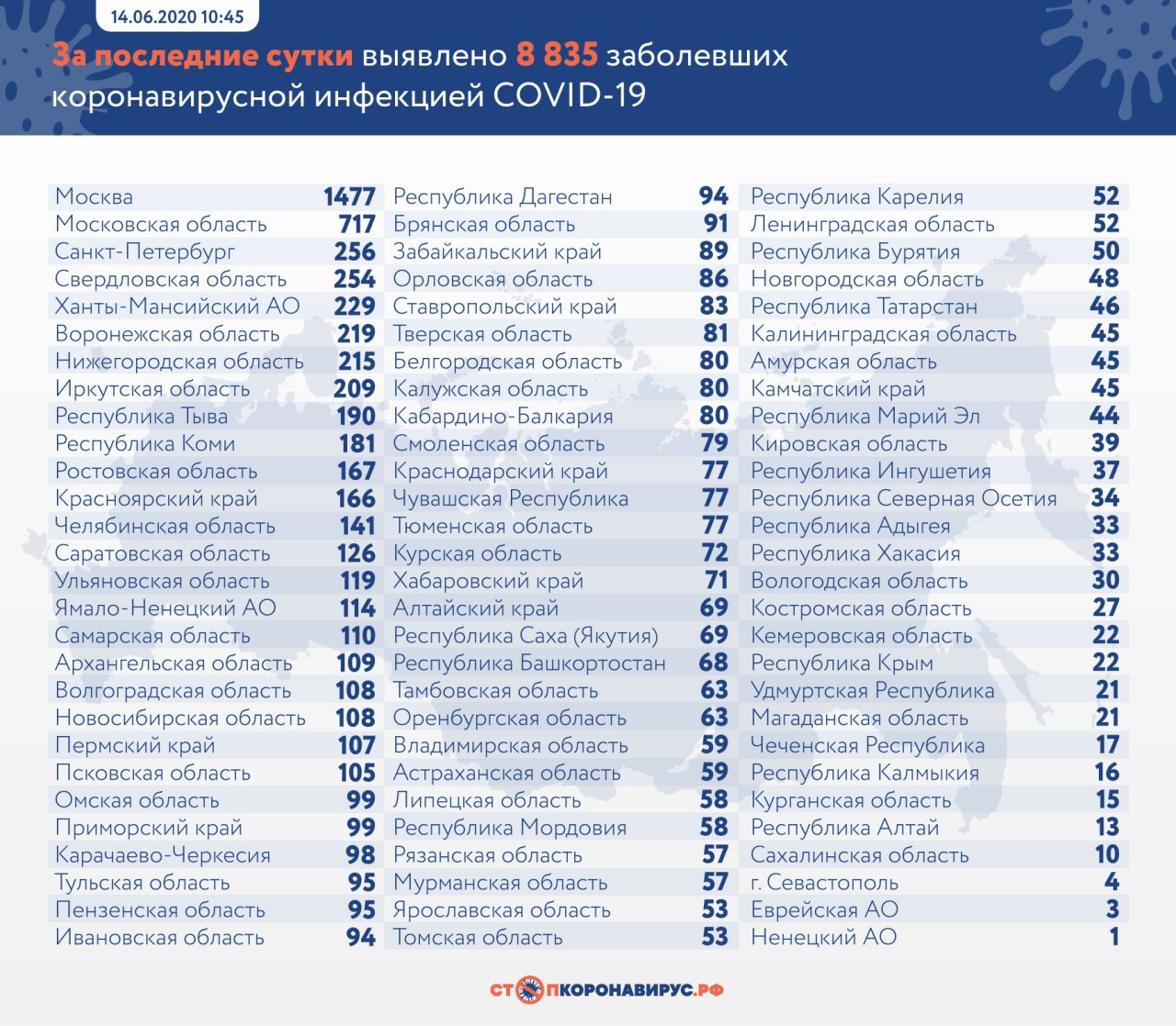 За последние сутки в России выявлено 8 835 заболевших новой коронавирусной инфекцией в 84 регионах. Всего в стране выявлено 528 964 заболевших в 85 регионах.