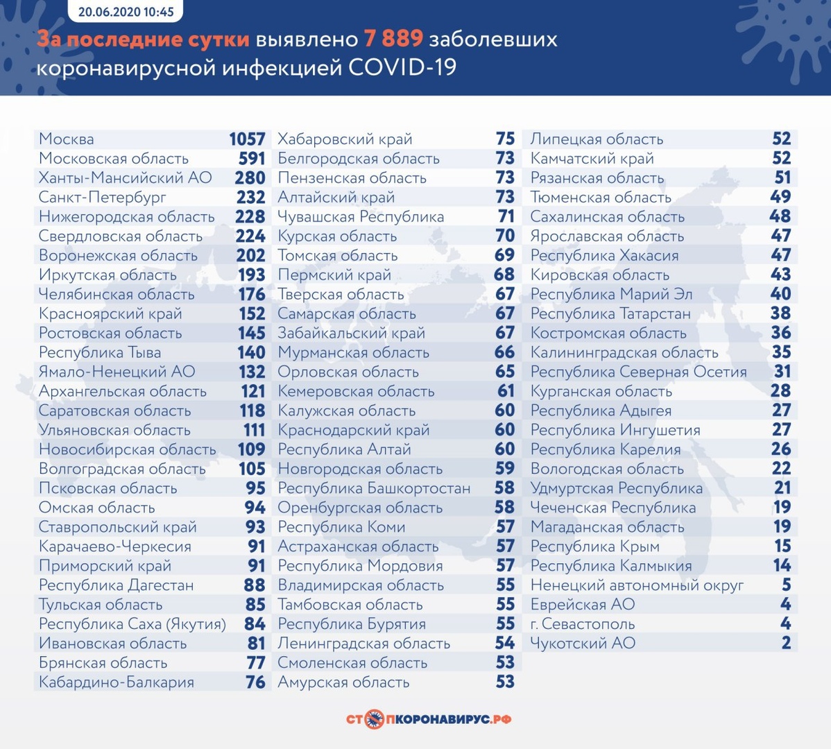 За последние сутки в России выявлено 7 889 новых случаев коронавируса в 85 регионах. Из них 32,7% не имели клинических проявлений болезни. Зафиксирован 161 летальный исход. За сутки в России полностью выздоровело 10 186 человек.