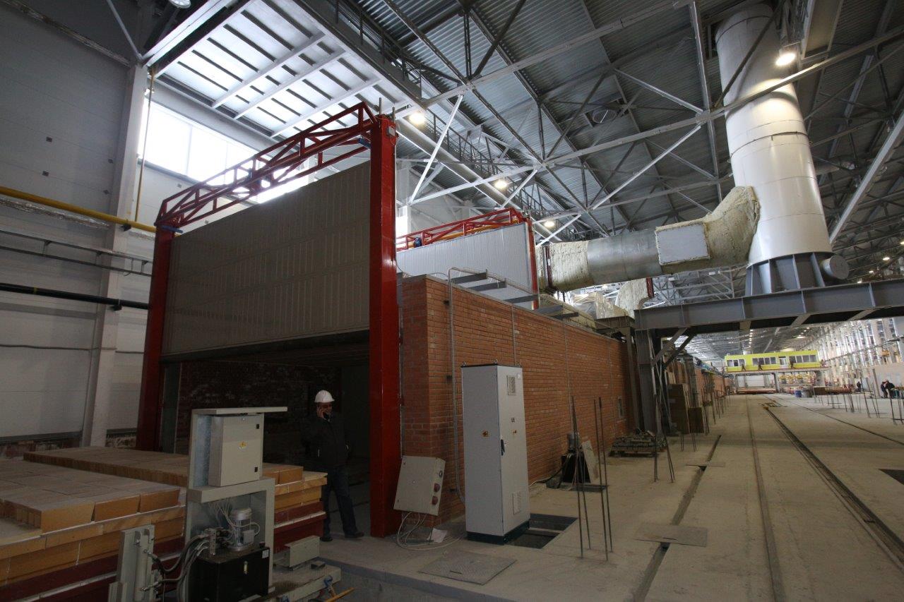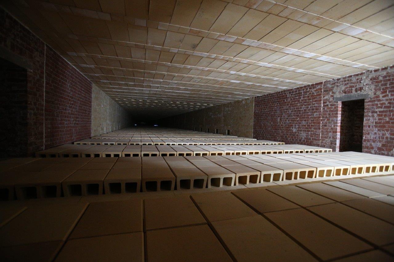 «Длина обжиговой печи составляет 179 метров. Своего рода это тоннель, разделенный на три части. В начале сухой кирпич будет нагреваться, затем при температуре порядка тысячи градусов обжигаться, а потом постепенно остывать, на выходе мы получим уже готовую продукцию. Качество продукции напрямую зависит от длины печи, которая позволяет проводить все этапы постепенно, избегая резкого перепада температуры, который может привести к растрескиванию материала. В среднем весь процесс обжига одной партии кирпича будет занимать у нас порядка 35 часов», – рассказал начальник нового цеха Максим Иванов.