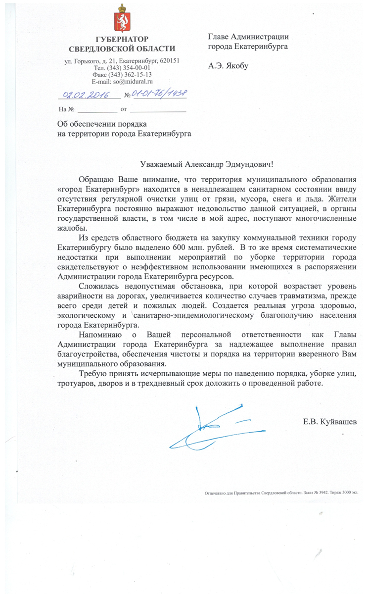 «Обращаю Ваше внимание, что территория муниципального образования «город Екатеринбург» находится в ненадлежащем санитарном состоянии ввиду отсутствия регулярной очистки улиц от грязи, мусора, снега и льда. Жители Екатеринбурга постоянно выражают недовольство данной ситуацией, в органы государственной власти, в том числе в мой адрес, поступают многочисленные жалобы», – говорится в обращении губернатора Евгения Куйвашева.