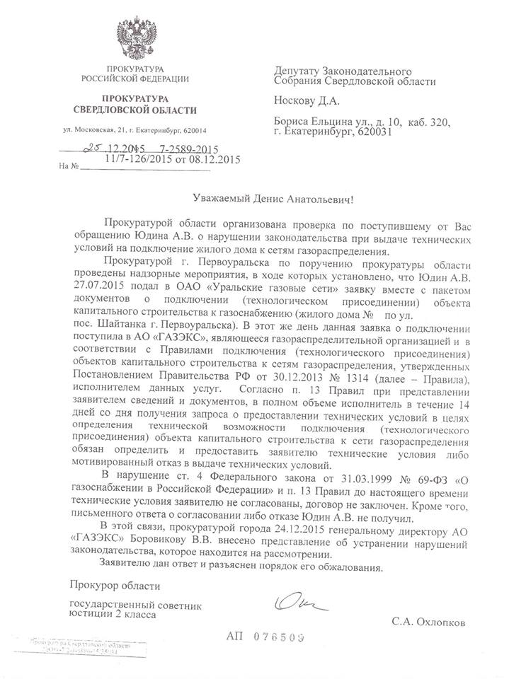 «ГАЗ – это наше всё. А мы для газовиков ничто. Получил ответ из областной прокуратуры на мой запрос по волоките в АО «ГАЗЭКС» по газификации частного дома в районе Шайтанка г. Первоуральска. В результате проведенной проверки установлено, что в нарушение ст. 4 Федерального закона от 31.03.1999 № 69-ФЗ «О газоснабжении в Российской Федерации» и п. 13 Правил до настоящего времени технические условия заявителю не согласованы, договор не заключен. Кроме того, письменного ответа о согласовании либо отказе гражданин не получил. В связи с чем, генеральному директору АО «ГАЗЭКС» Боровикову В.В. внесено представление об устранении нарушений законодательства», – сообщает депутат Денис Носков.