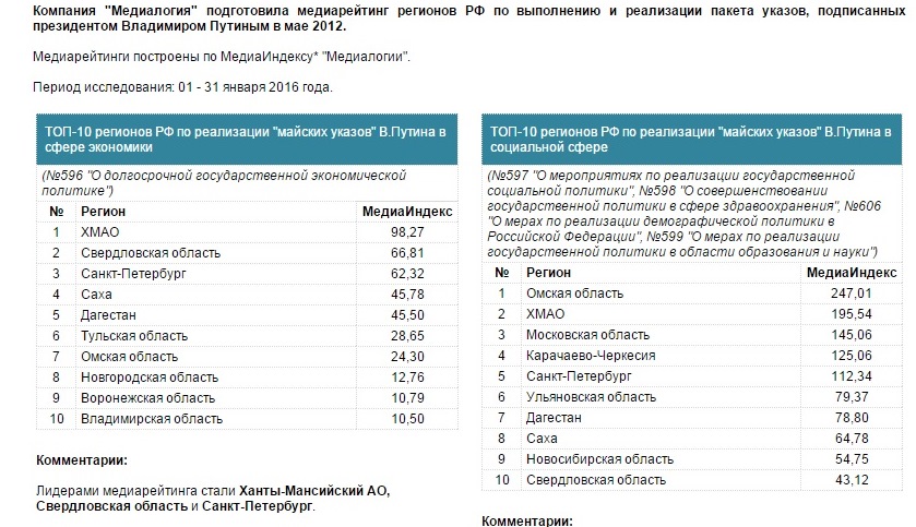 В «Медиалогии» отмечают, что в январе губернатор Свердловской области Евгений Куйвашев на встрече с главами муниципалитетов, посвященной социально-экономическому развитию северных районов области, озвучил предварительные итоги 2015 года. По словам главы региона, Среднему Уралу удалось достичь главного – обеспечить реализацию комплекса «майских указов» Владимира Путина, стабильную работу промышленных предприятий, увеличить темпы жилищного строительства. Задача 2016 года – не снижать темпы развития экономики, выполнения социальных обязательств.