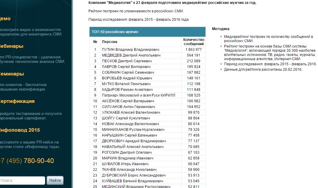 Возглавляет рейтинг глава России Владимир Путин, на второй позиции – председатель федерального правительства Дмитрий Медведев, на третьей строчке – пресс-секретарь президента Дмитрий Песков. Мероприятие для возрастной категории 18+