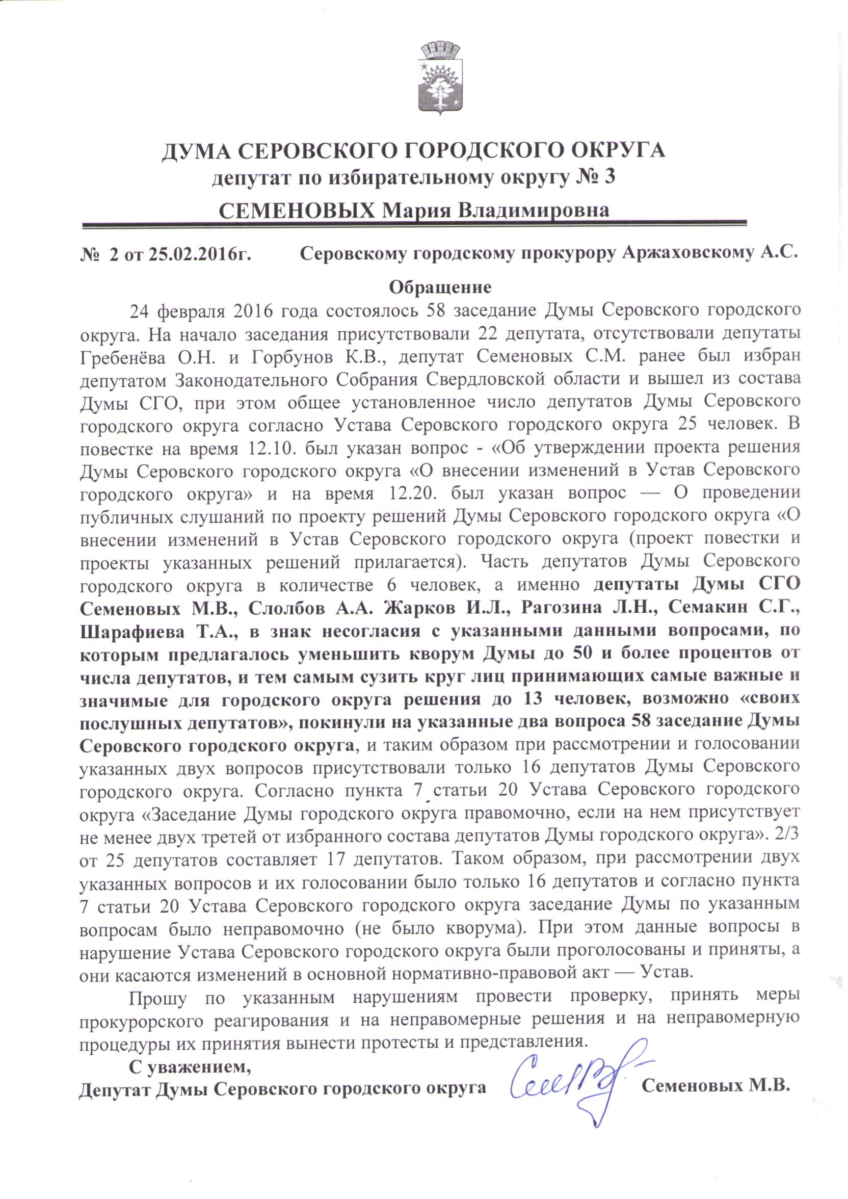 «Прошу по указанным нарушениям провести проверку, принять меры прокурорского реагирования и на неправомерные решения и на неправомерную процедуру их принятия вынести протесты и представления», – отмечено в обращении Марии Семеновых на имя серовского городского прокурора Андрея Аржаховского.