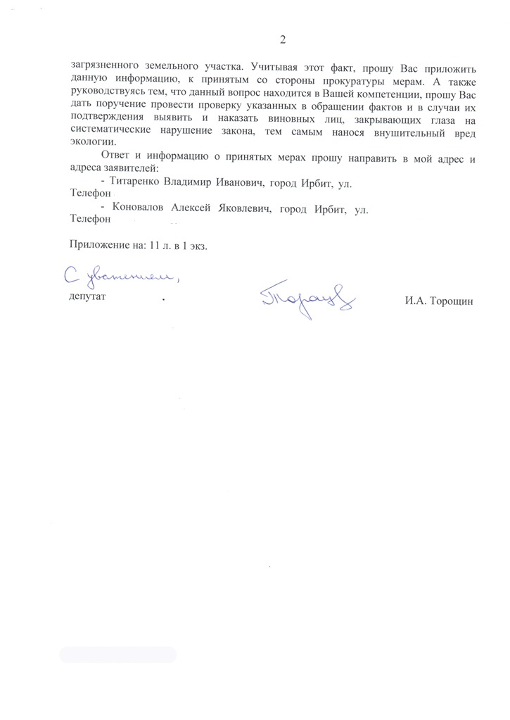 В мае 2015 года в результате другого депутатского запроса Игоря Торощина региональный Росприроднадзор провел внеплановую проверку, по результатам которой было выявлено химическое загрязнение почв данного района на площади 360 кв. м. По результатам проверок ирбитский «Водоканал-сервис» должен был выполнить предписания Росприроднадзора и возместить нанесенный ущерб, проведя рекультивацию зараженного химическими отходами участка. Но, по мнению жителей, этого не было сделано. Однако однозначно утверждать, что нынешнее загрязнение фекалиями возникло от деятельности предприятия, пока нельзя, так как повторные проверки только предстоят.
