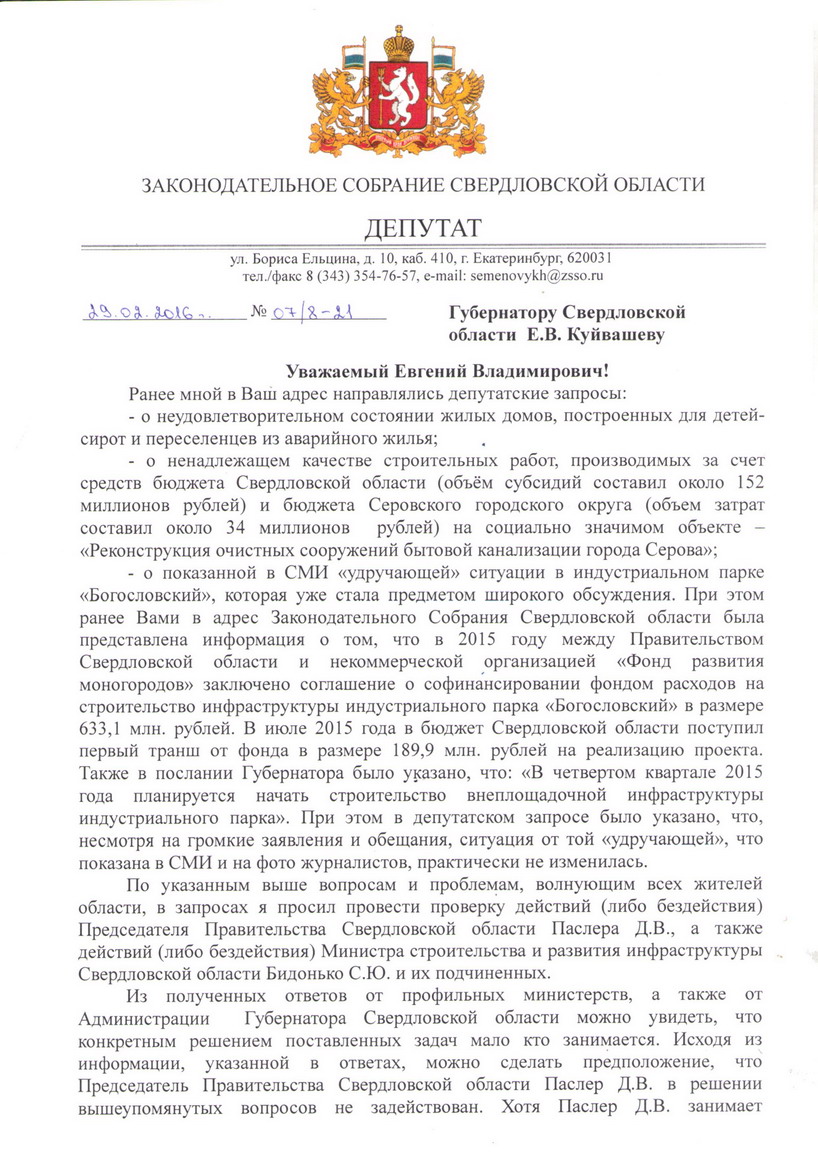 «По указанным выше вопросам и проблемам, волнующим всех жителей области, в запросах я просил провести проверку действий (либо бездействий) Председателя Правительства Свердловской области Паслера Д.В., а также действий (либо бездействий) Министра строительства и развития инфраструктуры Свердловской области Бидонько С.Ю. и их подчиненных», – отмечается в запросе Сергея Семеновых.