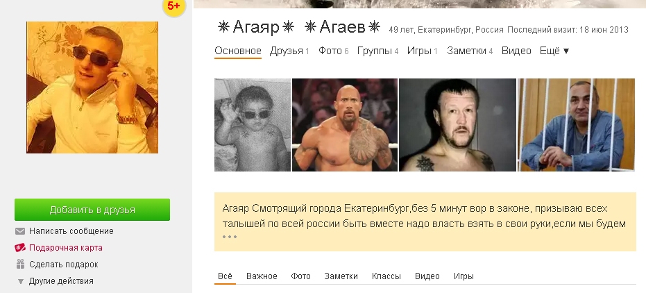 Эту версию подтверждает и другой спорный факт, к которому можно относиться критически. В социальной сети «Одноклассники» от имени Агаяра Агаева появилось заявление, что теперь он командует городом. «Весь Уралмаш будет под нами. Есть я - Агаяр и Ровшан Джаниев, больше блатных быть не может», – пишет пользователь сайта, личность которого установить невозможно. Что интересно, последний раз он заходил на страничку в июне 2013 года, то есть за два с половиной года до событий минувшей ночи.
