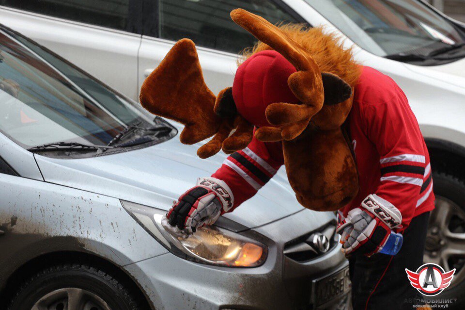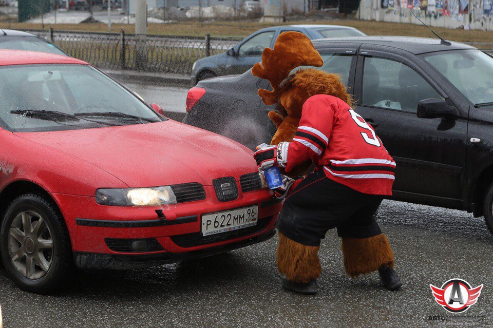 Помимо этого маскот мокрой тряпкой протер несколько фар автомобилей, которые из-за большого количества грязи в Екатеринбурге быстро пачкаются.