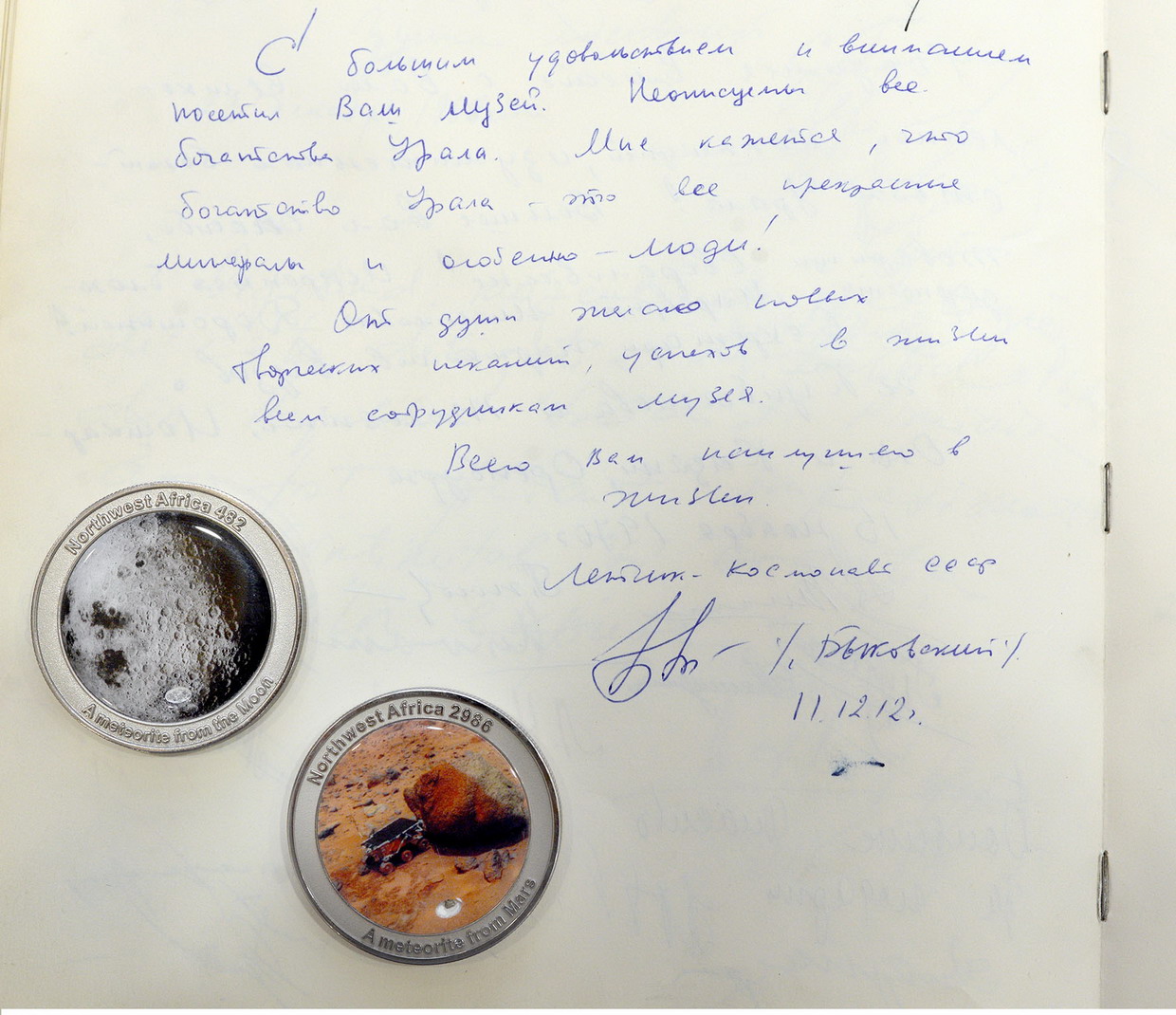«С большим удовольствием и вниманием посетил ваш музей. Неоценимы все богатства Урала. Мне кажется, что богатства Урала – это все прекрасные минералы и особенно – люди. От души желаю новых творческих проектов, успехов в жизни всем сотрудникам музея», – написал в книге отзывов 11 декабря 1972 года летчик-космонавт СССР Валерий Быковский.