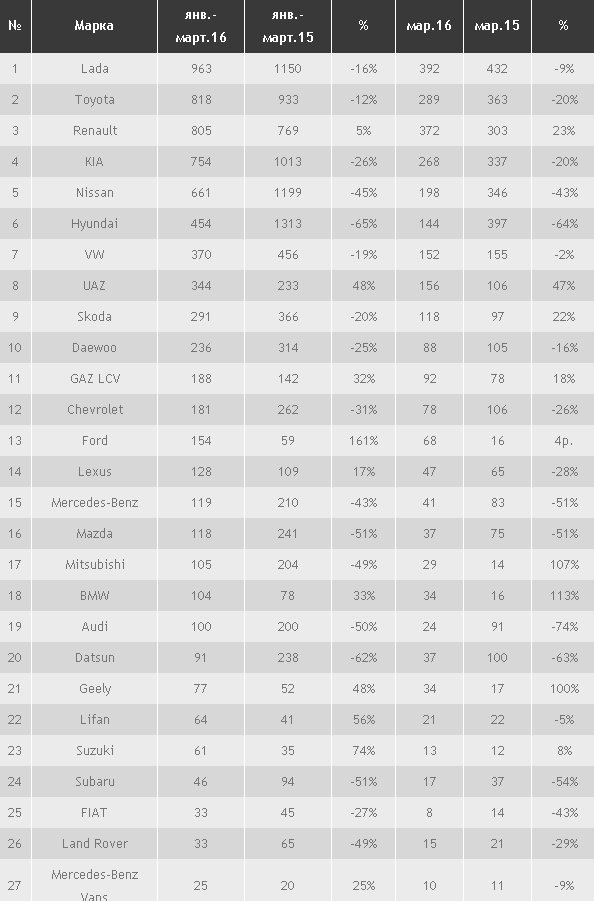 Лидером первого квартала стала Lada. Правда, продажи отечественного бренда сократились на 16%. После провала в первые два месяца в первую тройку поднялся Renault. Французская марка наряду с UAZ демонстрирует положительную динамику продаж среди брендов, представленных в топ-10.