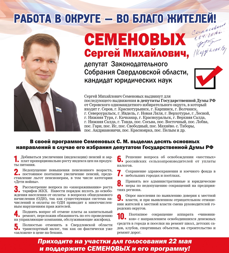 Депутат Законодательного собрания Свердловской области Сергей Семеновых опубликовал свою программу в качестве кандидата в Госдуму РФ. В программе народный избранник выделил десять основных направлений, которые он будет реализовывать в случае избрания в федеральный парламент.