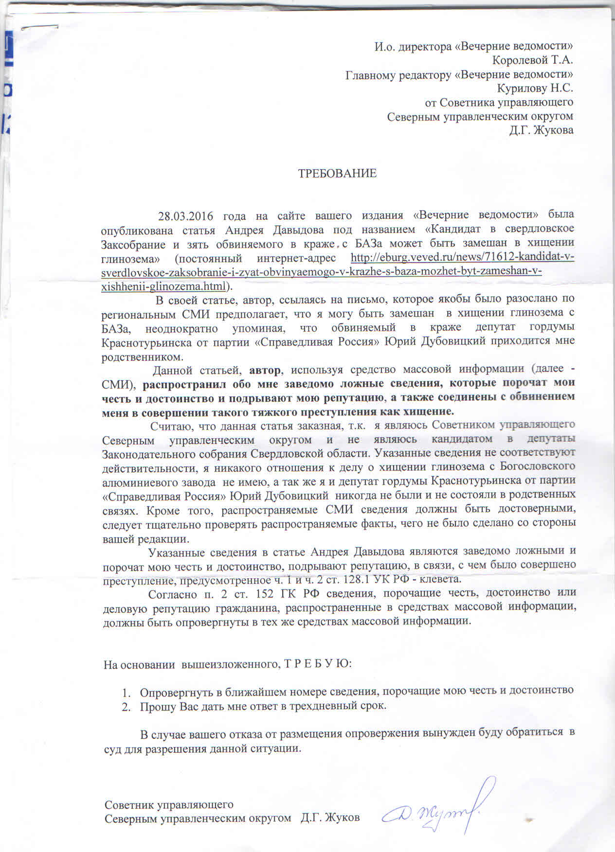 После публикации на сайте «Вечерних Ведомостей» новости под названием «Кандидат в свердловское Заксобрание и зять обвиняемого в краже с БАЗа может быть замешан в хищении глинозема» в адрес редакции поступило требование от советника управляющего Северным управленческим округом Д.Г. Жукова: