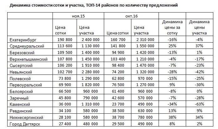 Средняя стоимость сотки земли в столице Свердловской области в октябре этого года составила 160 700 рублей. По сравнению с ноябрем 2015 года цена снизилась на 16%, а сами участки в среднем подешевели на 4%. Самое заметное снижение в Каменском (34%), в Невьянском (38%) и Полевском районах (15%).