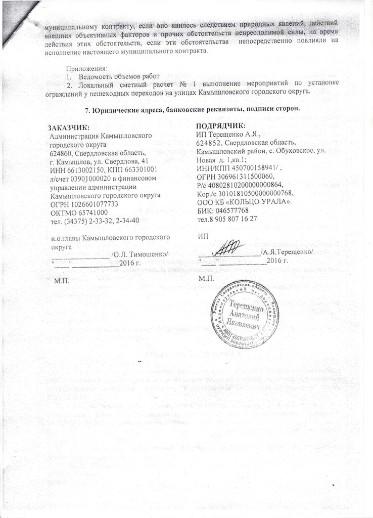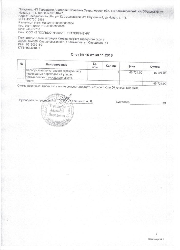 В распоряжение издания veved.ru попали документы о заключении муниципального контракта № 59-10-16, подписанного 31 октября между администрацией Камышловского городского округа в лице и.о. главы Олега Тимошенко и индивидуальным предпринимателем Анатолием Терещенко. Согласно условиям контракта, бизнесмен должен был установить ограждения около пешеходных переходов на улицах КГО. Сумма относительно небольшая – всего 45 тыс. 724 рубля.
