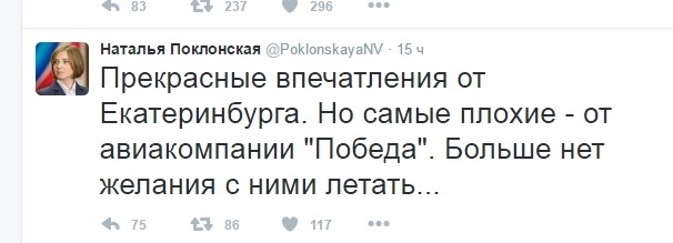 «Прекрасные впечатления от Екатеринбурга. Но самые плохие – от авиакомпании «Победа». Больше нет желания с ними летать…» – написала в «Твиттере» Наталья Поклонская.