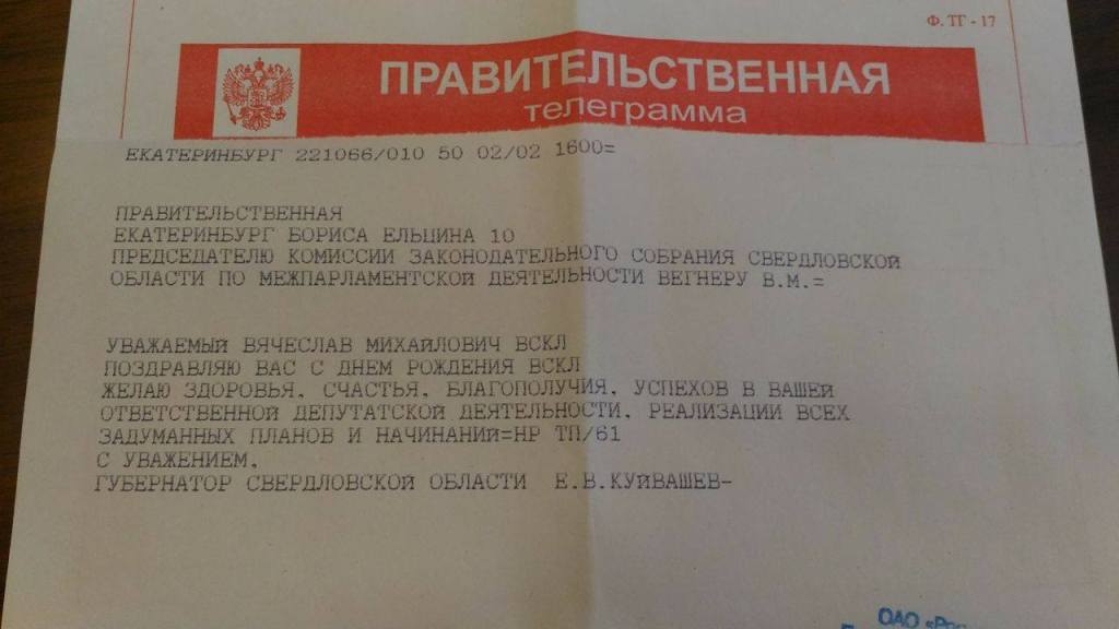 «Уважаемый Вячеслав Михайлович! Поздравляю Вас с днем рождения! Желаю здоровья, счастья, благополучия, успехов в вашей ответственной депутатской деятельности, реализации всех задуманных планов и начинаний» – телеграмма от главы региона Евгения Куйвашева пришла одной из первых.