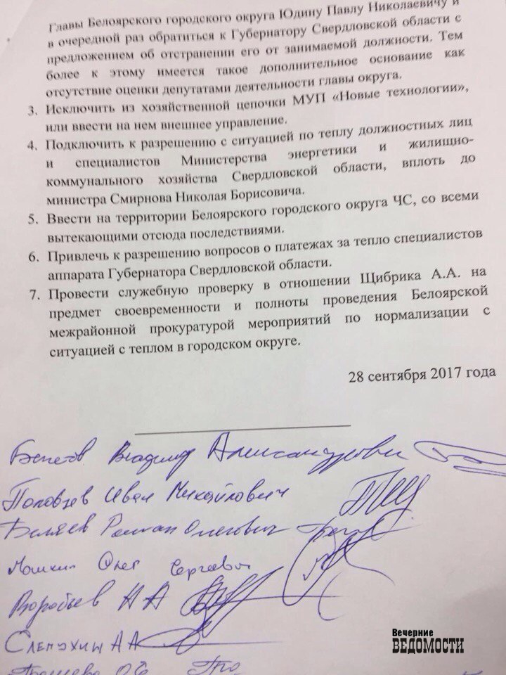Кроме этого, депутаты предлагают рассмотреть возможность ввести внешнее управление на МУП «Новые технологии» (в настоящее время в арбитражном суде рассматривается дело о дисквалификации директора предприятия Владимира Юрлова по иску налоговой инспекции) и просят подключить к разрешению с ситуацией по теплу должностных лиц и специалистов МинЖКХ, вплоть до министра Николая Смирнова. Также они предлагают весьма жесткое решение — ввести на территории Белоярского городского округа режим ЧС.