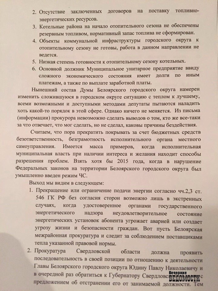 Депутаты Белоярки просят свердловского прокурора «решить вопрос» с главой и отоплением