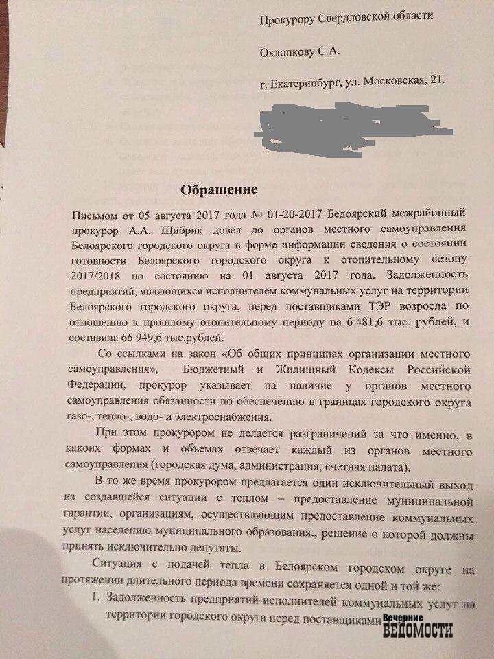 Депутаты Думы Белоярского городского округа направили коллективное обращение прокурору Свердловской области Сергею Охлопкову. Поводом стал очередной срыв отопительного сезона в муниципалитете — в садиках и школах замерзают дети, а компания МУП «Новые технологии», ответственная за подачу тепла, накопила многомиллионные долги перед поставщиками ресурсов.