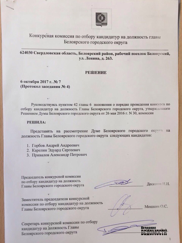 По данным источников издания, на думу будут вынесены три фамилии из девяти ранее заявленных: это Андрей Горбов (экс-начальник Белоярской поселковой управы), Эдуард Карелин (экс-заместитель главы Белоярского городского округа по экономике) и Александр Привалов (экс-глава Белоярки).