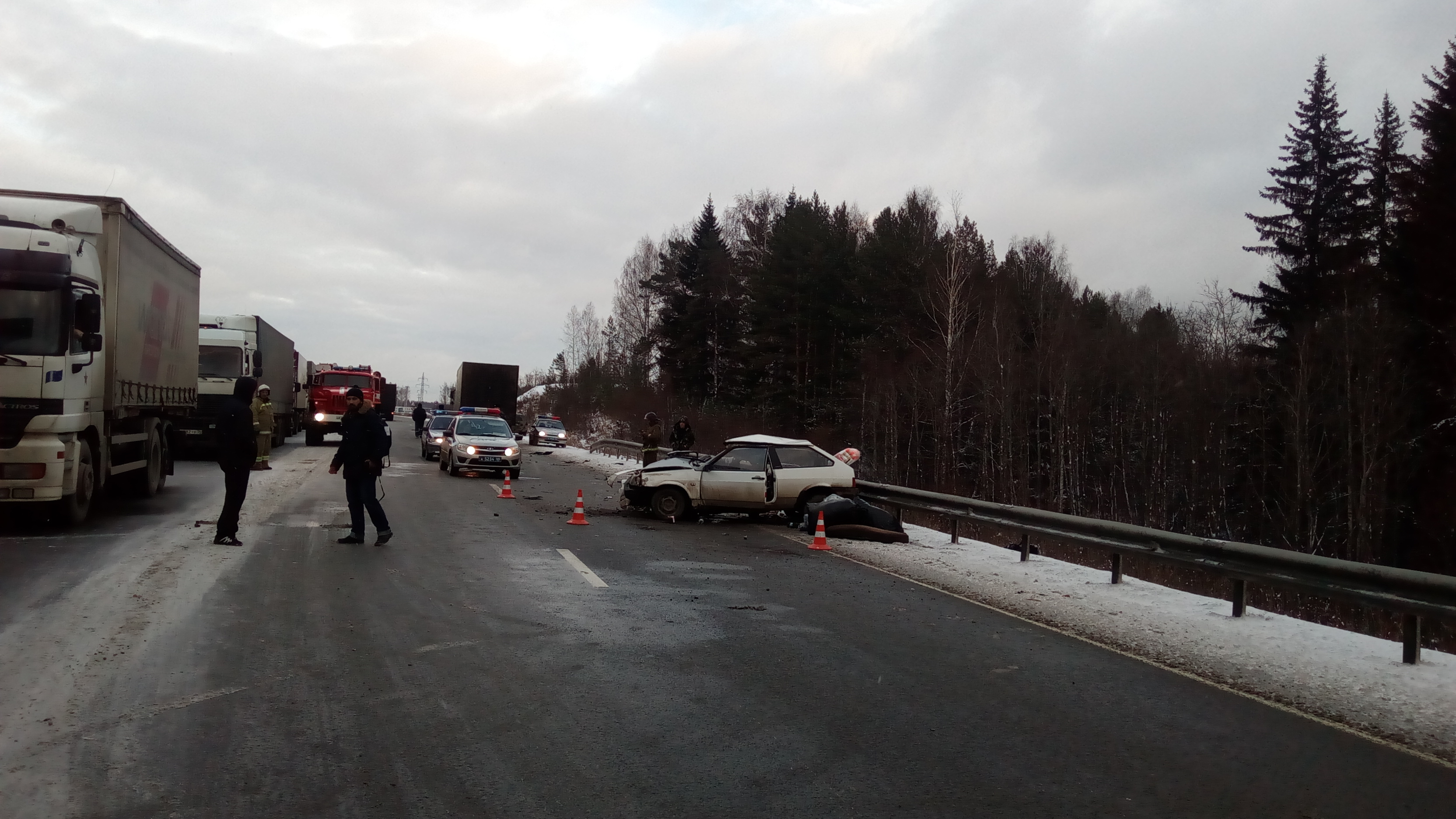 Накануне днем на трассе Пермь — Екатеринбург произошло ДТП: автомобиль ВАЗ-2108 выехал на встречную полосу, где столкнулся с грузовиком «Скания». В результате пострадала пассажирка ВАЗа — 48-летняя женщина. Ее доставили в больницу с множественными травмами.