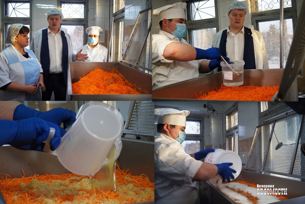 На примере приготовления популярной закуски «морковь по-корейски» Дмитрию Чукрееву показали, как здесь готовятся салаты. Так, морковь после промывки поступает в цех, где приобретает привычную нам форму — сотрудники не используют ножей, применяя специальный станок. «Нарезав» 90 килограммов, морковь засыпают в емкость, после чего в определенных пропорциях добавляют уксус, подсолнечное масло и специи и перемешивают. Остается только расфасовать по пластиковым коробочкам, наклеить этикетку — и можно отправлять на полки супермаркетов. До отгрузки продукция хранится в холодильниках.