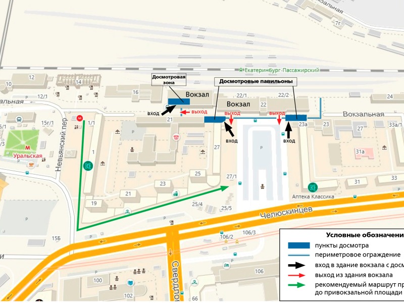 С 28 декабря в Екатеринбурге изменится схема движения пассажиров по территории, прилегающей к железнодорожному вокзалу. Теперь, чтобы от станции метро «Уральская» попасть на привокзальную площадь, а также к остановкам общественного транспорта, нужно будет пройти по переулку Невьянскому, затем повернуть на улицу Челюскинцев.