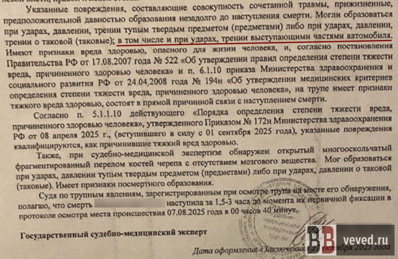 Вторая версия второй судебно-медицинской экспертизы — в ней уже добавлено «автомобиль» на последней странице. Кстати, её делали уже 29 октября, а дата всё та же, что и на первом варианте — 27 октября. Может, есть ещё какая-то третья или четвёртая версия второй СМЭ. Но мне неизвестно. Следователь полиции просил вернуть последнюю страницу первой версии второй экспертизы,