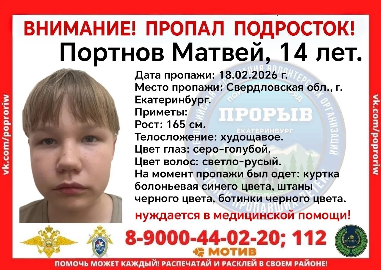 В Екатеринбурге с 18 февраля ищут 14-летнего Матвея Портнова. Ориентировку на подростка опубликовал поисковый отряд «Прорыв».