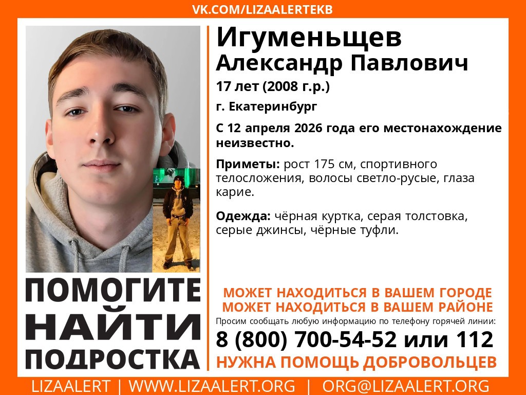 В Екатеринбурге продолжаются поиски 17-летнего Игуменьщева Александра, чьё местонахождение остаётся неизвестным с 12 апреля. Ориентировку на подростка опубликовал поисково-спасательный отряд «ЛизаАлерт» Свердловской области.