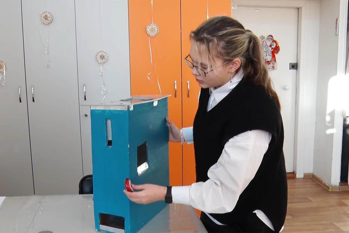 В Нижнем Тагиле школьница Юлия Южакова создала аппарат для утилизации жестяных банок, который меняет сжатые банки на корм для животных. Девочка сделала его из вторсырья.