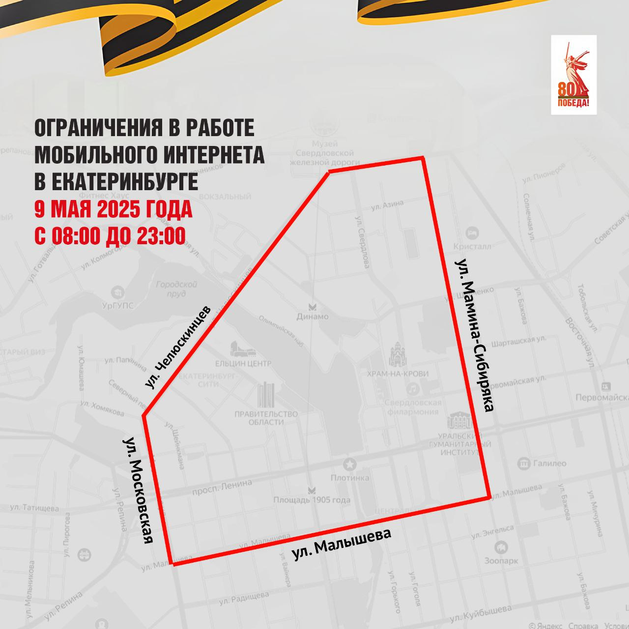 Завтра, 9 мая, в центре Екатеринбурга отключат интернет. Это необходимо для усиления мер антитеррористической защищенности на период празднования 80-й годовщины Победы в Великой Отечественной войне.