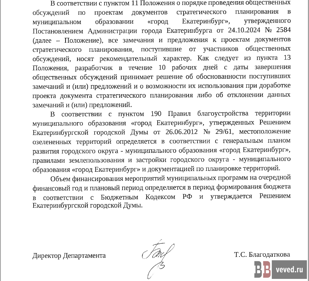 Вечерние ведомости сделали запрос в администрацию и получили ответ за подписью директора департамента благоустройства Тамары Благодатковой.