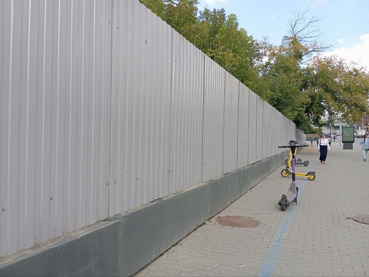 Градозащитники возмущаются тем, что на установленном капитальном заборе не размещают информационные щиты, и напоминают, что работы производятся в охранной зоне объекта культурного наследия «Госпиталь Екатеринбургского завода».
