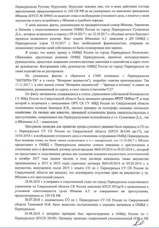 В свою очередь, не дождавшись от следствия каких-то активных действий, поняв, что уголовное дело в отношении сотрудников полиции возбуждать никто не планирует, я написал заявление о привлечении к уголовной ответственности Ибнеева за совершенное им мошенничество. 28.06.2018 я подал заявление в Первоуральский следственный отдел СУ СК России по Свердловской области, ему присвоили номер КРСП 507пр18. По моему заявлению органы СКР начали проведение проверки, но закончить в отведенные на это УПК РФ 30 суток не смогли и поручили провести дополнительные проверочные действия ОМВД г. Первоуральска, КУСП № 28189 от 03.08.2018. Там проверка сошла на нет, полицейские вынесли отказ в возбуждении уголовного дела в отношении Ибнеева.