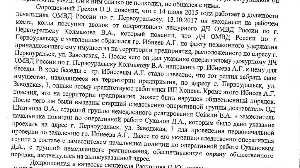 Факты, о которых сообщал я и иные свидетели, безусловно, принимались во внимание при проведении проверки и фиксировались, но показания полицейских были настолько выверенными и, как я считаю, заранее ими согласовались во избежание расхождений, что теперь они просто зайки. Как вы себе это представляете: в 11:00 13 октября 2017 года гражданин Ибнеев обратился в дежурную часть ОМВД г. Первоуральска с заявлением о привлечении меня к уголовной ответственности по ст. 330 УК РФ за самоуправство, т. е. незаконное удержание имущества, КУСП 30965. Оперативный дежурный ДЧ ОМВД по г. Первоуральску Колмаков незамедлительно связался по внутреннему телефону с Греховым Олегом Владимировичем – начальником ОМВД России по г. Первоуральску – и сообщил о правонарушении. Это у них такая практика – сообщать о каждом поступившем заявлении начальнику райотдела или это произошло только в этом конкретном случае? Грехов дает поручение дежурному Колмакову направить заявителя Ибнеева к нему для беседы. Зачем? Конечно, такой подход приветствуется, но почему он единичный, почему это ни у кого не вызывает вопросов?