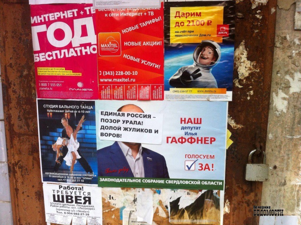 Так, в Екатеринбурге в микрорайоне Птицефабрика (входит в состав Белоярского одномандатного избирательного округа) агитацию с изображением Ильи Гаффнера заклеивают листовкой с популярной некогда фразой про жуликов и воров. Вероятно, кандидат вызывает настолько отрицательные эмоции у части населения, что они готовы в свободное время заниматься подобным народным творчеством.